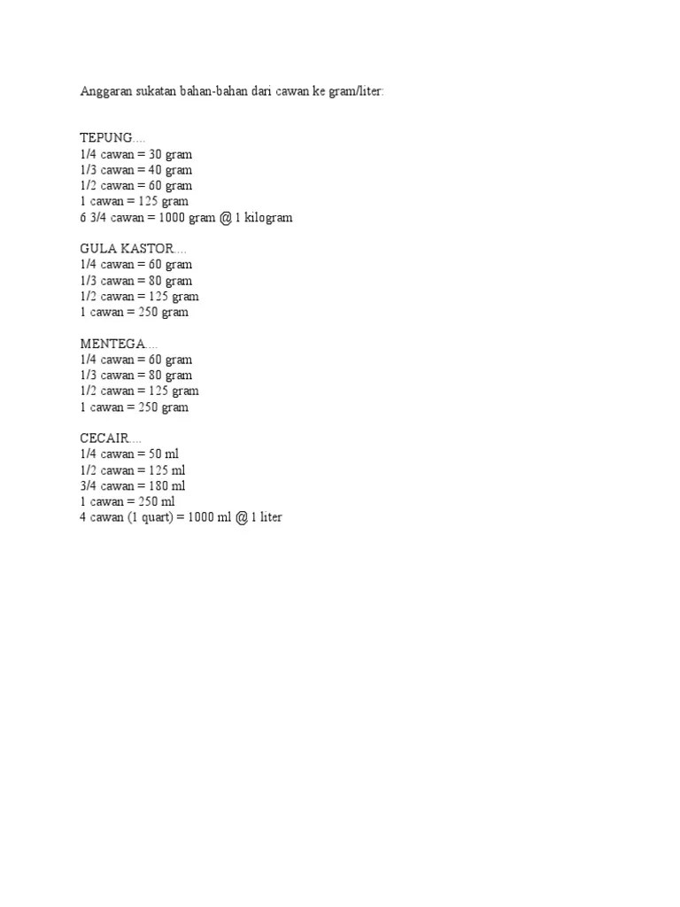 1 cawan = 125 gm 2 cawan = 250 gm 3/4 cawan = 90 gm 1/4 cawan = 60 gram 1/3 cawan = 80 gram 1/2 cawan = 125 gram 3/4 cawan . 3 4 cawan bersamaan berapa gram. Sukatan tepung mentega gula cecair gram cawan penyajian makanan makanan penutup makanan. 80 gram = 1/4 cawan 125 gram = 1/2 cawan 190 gram = 3/4 cawan Bahagikan angka ini dengan 4 bahagian, . Sebagai cawan 3 4 mengambil standard jumlah kaca nipis 250 g atau 250 ml. 500 gram = 4 cawan 10 gram = 2 sudu kecil 15 gram = 2 sudu besar. 2 mangkuk untuk makan nasi dsb. Tepung gandum 1 3/4 cawan(3/4 sukatan die hampir penuh 1 cawan) jgn ko bedal 13 cawan pulak ayak dgn 1sk baking powder. Bahan yang menggunakan cawan adalah seperti tepung dan gula. Sukatan tepung mentega gula cecair gram cawan baking ingredients .